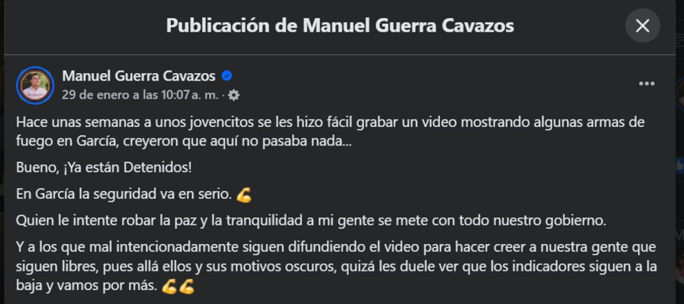 “A few weeks ago, some young people found it easy to record a video showing some firearms in García, they thought that nothing was happening here…” is part of what Guerra Cavazos reported.